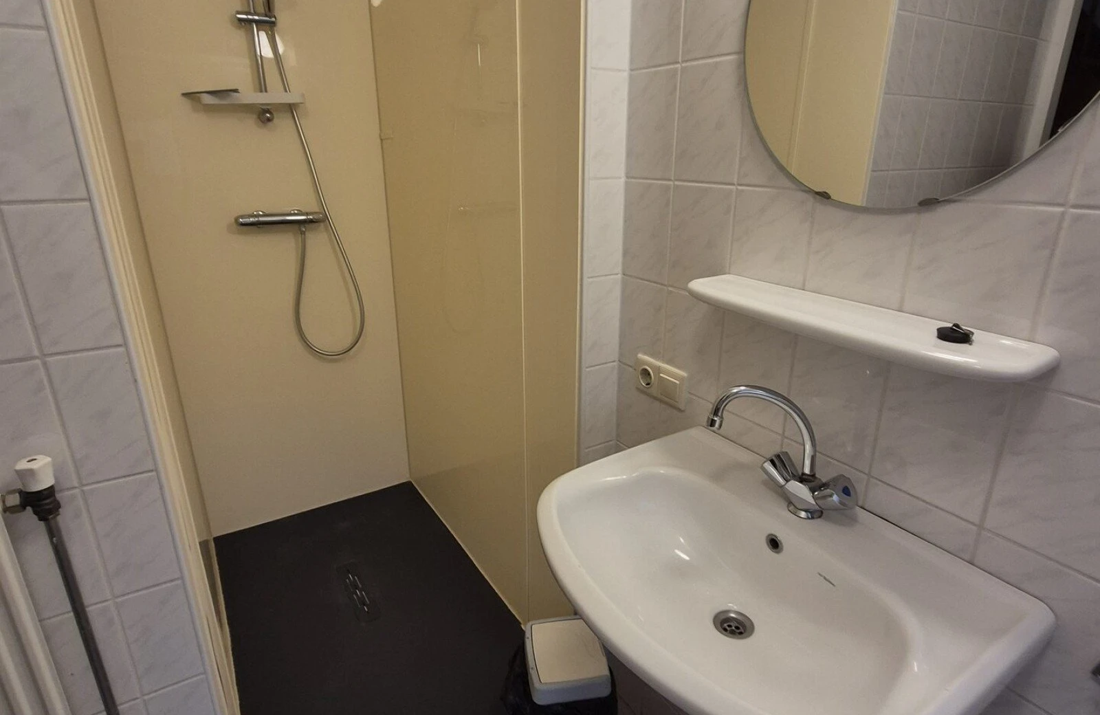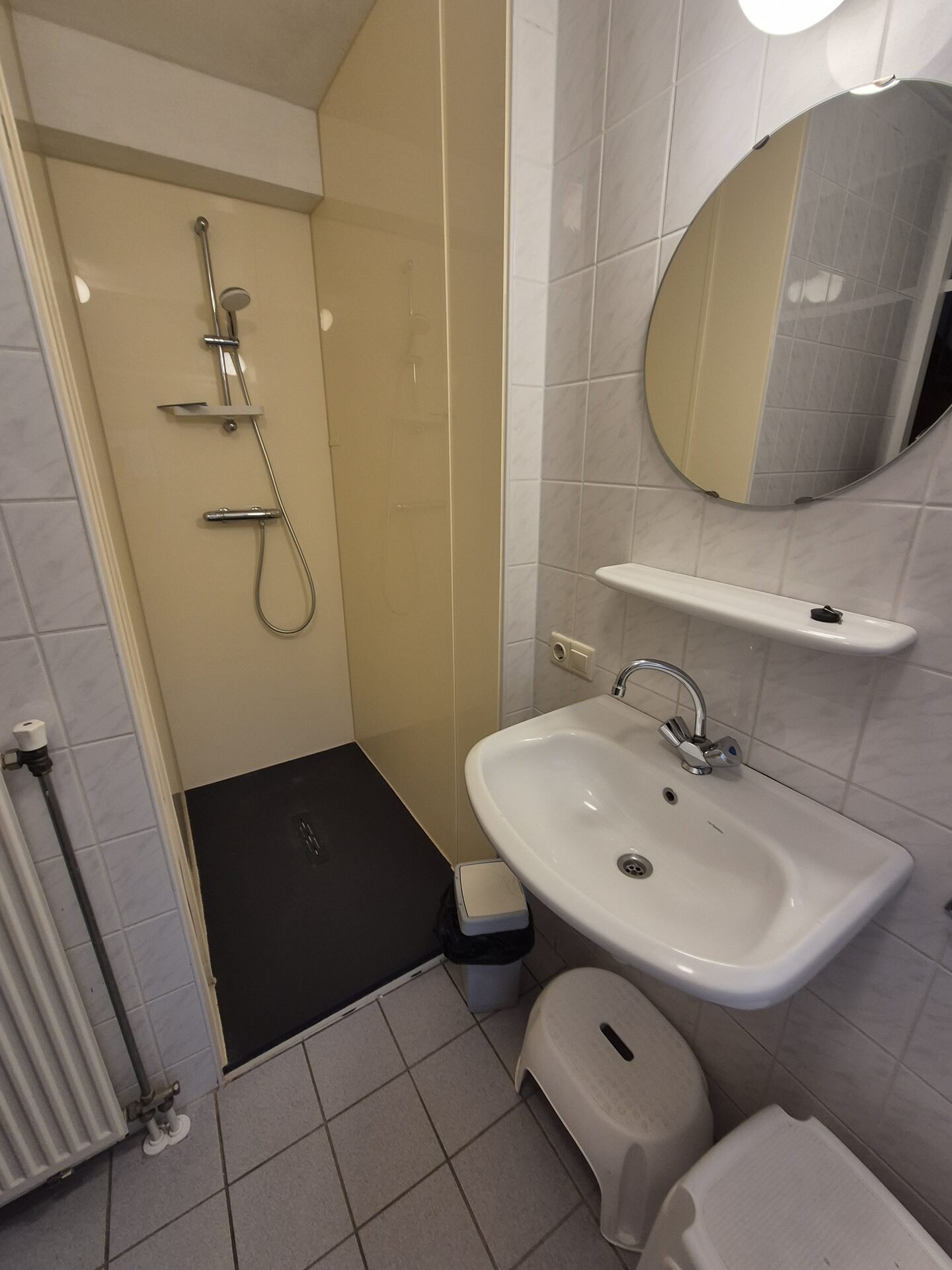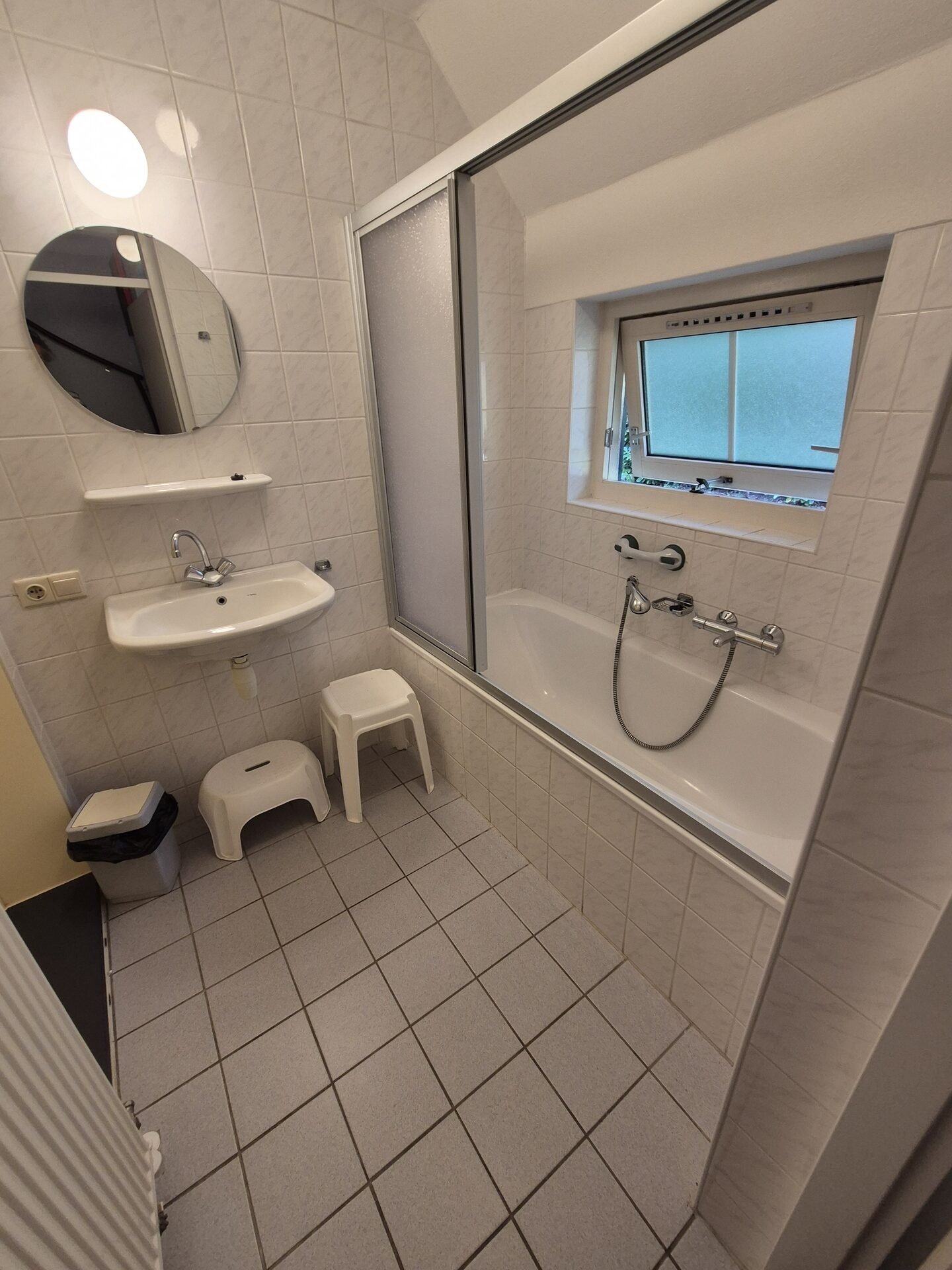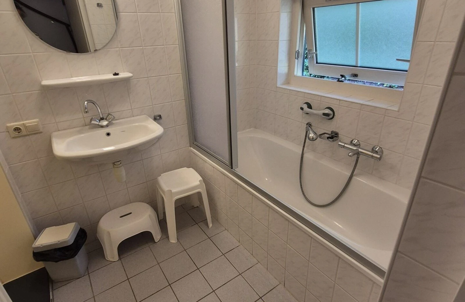 - Badezimmer (im Erdgeschoss) mit Waschbecken und einer Badewanne mit Dusche.